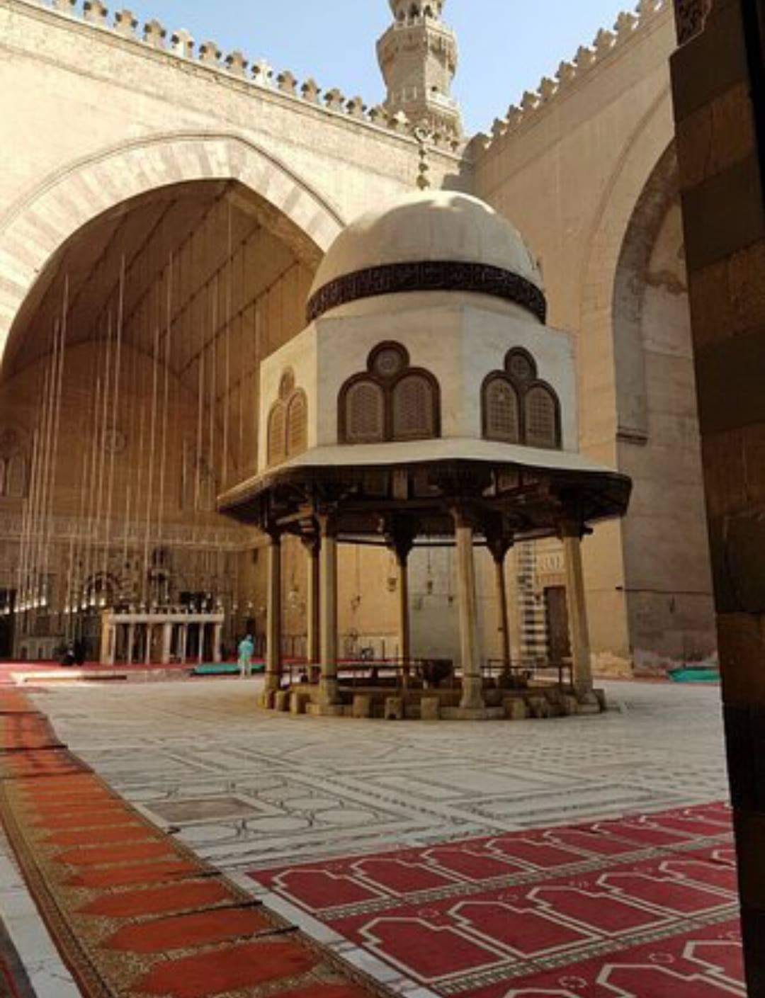 The mosque has two lighthouses built on round bases, such as the two towers of the Sultan Hassan Mosque. The entrances are tall and are surrounded by stone and marble pillars with their Arabic crowns, and their thresholds are covered with marble and covered with gilded ceilings and ceilings.