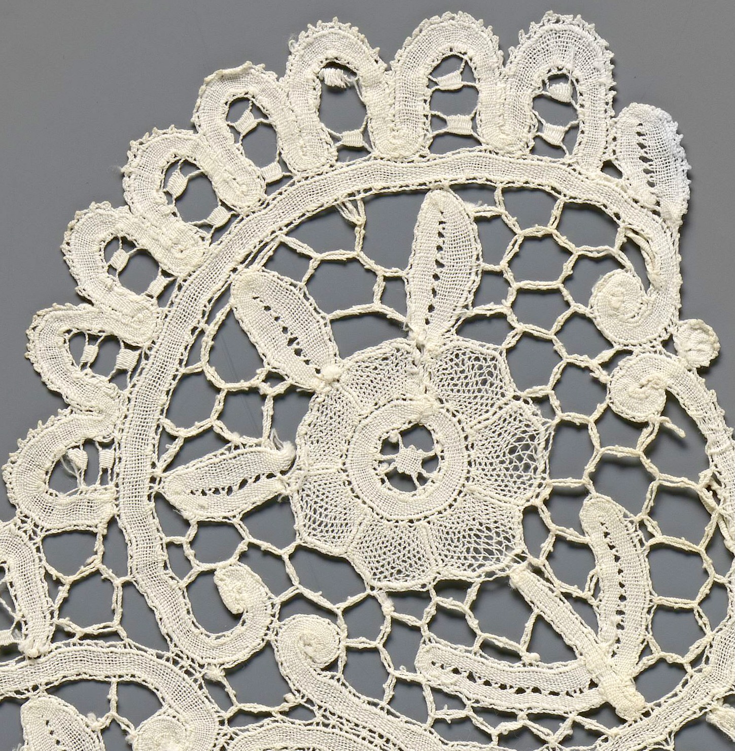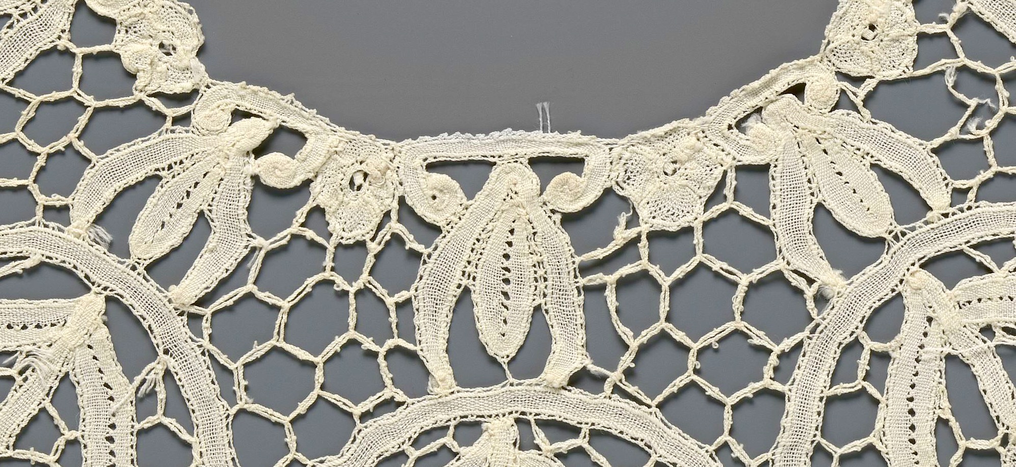 The motifs are connected by ground with double braids that form hexagons. The cotton collar is from 1900 Bruges, Belgium, and is 17.32 x 6.69” (44 x 27 cm).